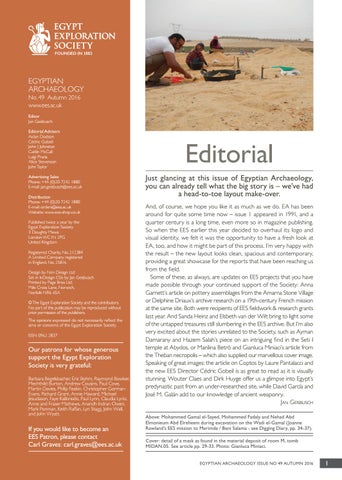 Our patrons for whose generous support the Egypt Exploration Society is very grateful: Barbara Begelsbacher, Eric Bohm, Raymond Bowker, Mechthild Burton, Andrew Cousins, Paul Cove, Martin Davies, Philip Feakin, Christopher GormanEvans, Richard Grant, Annie Haward, Michael Jesudason, Faye Kalloniatis, Paul Lynn, Claudia Lyrio, Anne and Fraser Mathews, Anandh Indran Owen, Mark Ponman, Keith Raffan, Lyn Stagg, John Wall, and John Wyatt.