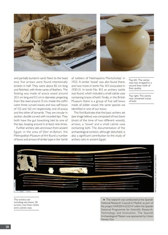 of soldiers of Nebhepetra Montuhotep’ in 1923. A similar ‘towel’ was also found there, and two more in tomb No. 813 excavated in 1930-31. In tomb No. 812 an archery tackle was found, which included a small calcite vase containing traces of kohl. Finally, in the British Museum there is a group of five self bows made of sidder wood, the same species we identified in one of our bows. This find illustrates that the basic archery set (see image below) was composed of two bows (most of the time of two different woods), arrows, a ‘towel’ and a small calcite vase containing kohl. The documentation of the archaeological context, although disturbed, is also a significant contribution to the study of archery sets in ancient Egypt.