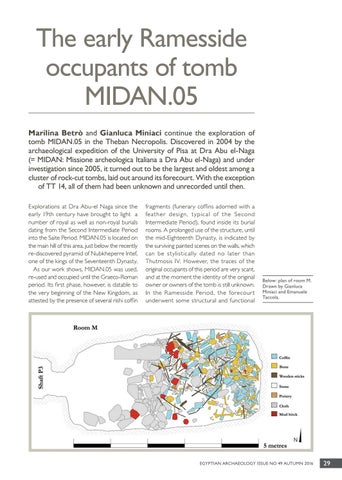 The early Ramesside occupants of tomb MIDAN.05 Marilina Betrò and Gianluca Miniaci continue the exploration of tomb MIDAN.05 in the Theban Necropolis. Discovered in 2004 by the archaeological expedition of the University of Pisa at Dra Abu el-Naga (= MIDAN: Missione archeologica Italiana a Dra Abu el-Naga) and under investigation since 2005, it turned out to be the largest and oldest among a cluster of rock-cut tombs, laid out around its forecourt. With the exception of TT 14, all of them had been unknown and unrecorded until then. Explorations at Dra Abu-el Naga since the early 19th century have brought to light a number of royal as well as non-royal burials dating from the Second Intermediate Period into the Saite Period. MIDAN.05 is located on the main hill of this area, just below the recently re-discovered pyramid of Nubkheperre Intef, one of the kings of the Seventeenth Dynasty. As our work shows, MIDAN.05 was used, re-used and occupied until the Graeco-Roman period. Its first phase, however, is datable to the very beginning of the New Kingdom, as attested by the presence of several rishi coffin