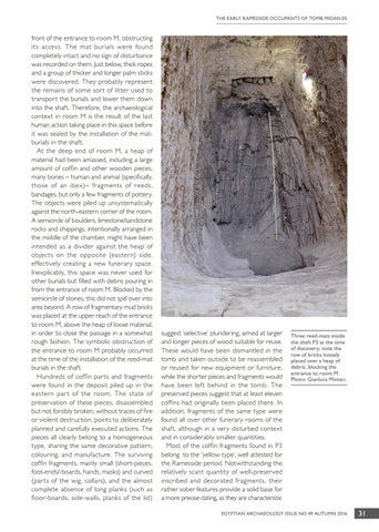 front of the entrance to room M, obstructing its access. The mat burials were found completely intact and no sign of disturbance was recorded on them. Just below, thick ropes and a group of thicker and longer palm sticks were discovered. They probably represent the remains of some sort of litter used to transport the burials and lower them down into the shaft. Therefore, the archaeological context in room M is the result of the last human action taking place in this space before it was sealed by the installation of the matburials in the shaft. At the deep end of room M, a heap of material had been amassed, including a large amount of coffin and other wooden pieces, many bones – human and animal (specifically, those of an ibex)– fragments of reeds, bandages, but only a few fragments of pottery. The objects were piled up unsystematically against the north-eastern corner of the room. A semicircle of boulders, limestone/sandstone rocks and chippings, intentionally arranged in the middle of the chamber, might have been intended as a divider against the heap of objects on the opposite (eastern) side, effectively creating a new funerary space. Inexplicably, this space was never used for other burials but filled with debris pouring in from the entrance of room M. Blocked by the semicircle of stones, this did not spill over into area beyond. A row of fragmentary mud bricks was placed at the upper reach of the entrance to room M, above the heap of loose material, in order to close the passage in a somewhat rough fashion. The symbolic obstruction of the entrance to room M probably occurred at the time of the installation of the reed-mat burials in the shaft. Hundreds of coffin par ts and fragments were found in the deposit piled up in the eastern par t of the room. The state of preservation of these pieces, disassembled but not forcibly broken, without traces of fire or violent destruction, points to deliberately planned and carefully executed actions. The pieces all clearly belong to a homogeneous type, sharing the same decorative pattern, colouring, and manufacture. The surviving coffin fragments, mainly small (short-pieces, foot-ends/-boards, hands, masks) and curved (par ts of the wig, collars), and the almost complete absence of long planks (such as floor-boards, side-walls, planks of the lid)