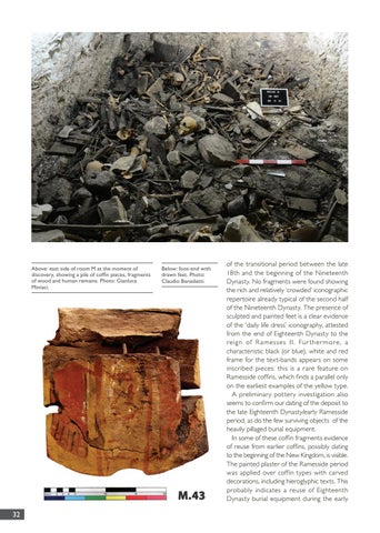 of the transitional period between the late 18th and the beginning of the Nineteenth Dynasty. No fragments were found showing the rich and relatively ‘crowded’ iconographic repertoire already typical of the second half of the Nineteenth Dynasty. The presence of sculpted and painted feet is a clear evidence of the ‘daily life dress’ iconography, attested from the end of Eighteenth Dynasty to the reign of R amesses II . Fur ther more, a characteristic black (or blue), white and red frame for the text-bands appears on some inscribed pieces: this is a rare feature on Ramesside coffins, which finds a parallel only on the earliest examples of the yellow type. A preliminary pottery investigation also seems to confirm our dating of the deposit to the late Eighteenth Dynasty/early Ramesside period, as do the few surviving objects of the heavily pillaged burial equipment. In some of these coffin fragments evidence of reuse from earlier coffins, possibly dating to the beginning of the New Kingdom, is visible. The painted plaster of the Ramesside period was applied over coffin types with carved decorations, including hieroglyphic texts. This probably indicates a reuse of Eighteenth Dynasty burial equipment during the early