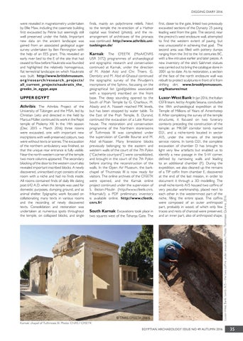 Karnak : The CFEETK (MoA/CNRS USR 3172) programmes of archaeological and epigraphic research and conservation continued at Karnak, under the direction of M. Abdel Aziz and Chr. Thiers. G. Dembitz and M. Abd el-Ghassul continued the epigraphic survey of the Pinudjem’s inscriptions of the Sphinx, focussing on the geographical list (god/goddess associated with a toponym) inscribed on the front base. The deep sounding opened to the South of Ptah Temple by G. Charloux, M. Abady and A. Nasseh reached MK levels, but has been stopped by water table. To the East of the Ptah Temple, B. Durand, continued the excavation of a Late Roman house. The restoration and conservation programme of the Northern storerooms of Tuthmosis III was completed under the supervision of Camille Bourse and M. Abd el-Nasser. Many limestone blocks previously belonging to the eastern and western walls of the court of the 7th Pylon (“Cachette courtyard”) were consolidated, and brought in the court of the 7th Pylon before starting the reconstruction of the walls. In the Open Air Museum, the barkchapel of Thutmosis III is now ready for visitors. The online archives of the CFEETK were opened, and the Karnak online project continued under the supervision of S. Biston-Moulin (http://www.cfeetk.cnrs. fr/karnak/); a PDF preliminary inventory is available online. http://www.cfeetk. cnrs.fr/ South Karnak: Excavations took place in two squares west of the Taharqa Gate. The