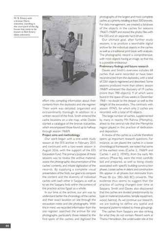 photographs of the largest and most complete caches as a priority, totalling at least 500 bronzes. For data management, we created a database of the objects in the caches for seasons 1966/7–1968/9 and stored the photo files with the EES and on separate hard drives. Our ultimate goal, after fur ther study seasons, is to produce a searchable digital archive for the individual objects in the caches as well as a traditional print book with analyses. The photographic record is comprehensive, with most objects having an image, so that this is a possible endeavour. Preliminary findings and future research Davies and Smith’s overview includes 68 caches that were recorded or have been reconstructed from the daybooks, with a total of 2261 objects registered and described. Some seasons produced more than others: season 1968/9 witnessed the discovery of 19 caches (more than 788 objects), 9 of which were found in the space of two weeks in December 1968 – no doubt to the despair as well as the delight of the excavators. This contrasts with season 1974/5, for which only 2 caches are recorded, with a total of 43 objects. This large number of caches, supplemented by many in nearby Mit Rahina (Memphis), attest to the central role that the Memphite region played in this practice of dedication and deposition. A review of the caches as a whole therefore opens up important research questions. For instance, as we placed the caches in a loose chronological framework, we noted that some of the earliest ones (Cache 2, 1968/9 and Caches 1 and 2, 1974/5), from the early 4th century (Phase IIa), were the most carefully laid and prepared, as well as being closely associated with specific building construction phases. Loose caches in debris and construction fills appear in all phases but dominate from Phase IIb (ca. 380–360 BC) onwards. The evidence thus seems to suggest that the practice of caching changed over time at Saqqara. Smith and Davies also discovered that the caches are divided predominantly by type or material (statuettes, temple equipment, wood, faience). As we continue our research, we are looking to define any spatial and temporal patterns related to these groupings. The caches from Saqqara are also striking for what they do not contain. Recent work at Thonis-Heracleion, the underwater site at the