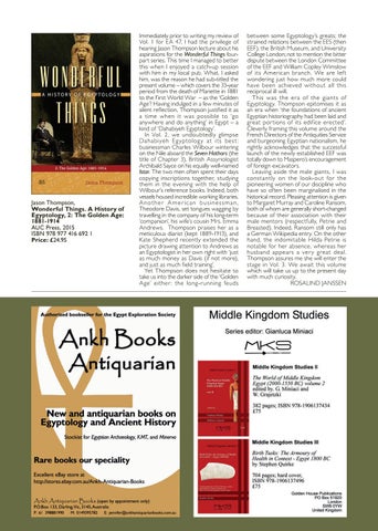 between some Egyptology’s greats; the strained relations between the EES (then EEF), the British Museum, and University College London; not to mention the bitter dispute between the London Committee of the EEF and William Copley Wimslow of its American branch. We are left wondering just how much more could have been achieved without all this reciprocal ill will. This was the era of the giants of Egyptology. Thompson epitomises it as an era when ‘the foundations of ancient Egyptian historiography had been laid and great por tions of its edifice erected’. Cleverly framing this volume around the French Directors of the Antiquities Service and burgeoning Egyptian nationalism, he rightly acknowledges that the successful launch of the newly established EEF was totally down to Maspero’s encouragement of foreign excavators. Leaving aside the male giants, I was constantly on the look-out for the pioneering women of our discipline who have so often been marginalised in the historical record. Pleasing attention is given to Margaret Murray and Caroline Ransom, both of whom are generally short-changed because of their association with their male mentors (respectfully, Petrie and Breasted). Indeed, Ransom still only has a German Wikipedia entry. On the other hand, the indomitable Hilda Petrie is notable for her absence, whereas her husband appears a ver y great deal. Thompson assures me she will enter the stage in Vol. 3. We await this volume which will take us up to the present day with much curiosity. ROSALIND JANSSEN