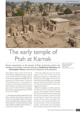 The early temple of Ptah at Karnak Recent excavations in the temple of Ptah at Karnak confirm the existence of an earlier mud-brick sanctuary. Guillaume Charloux and Christophe Thiers unveil the first elements of the discovery. The temple of Ptah, built by Thutmose III (1479–1425 BC, Eighteenth Dynasty), is located at the northern limit of the religious domain of Karnak (see Egyptian Archeology 38). The existence of an earlier temple – the date of which remains unknown – is recorded in two inscriptions of the present temple and on a stela erected by Thutmose III and restored later by Seti I (1290–1279 BC) (Catalogue général des antiquités égyptiennes du Musée du Caire, GC 34013): (…) My majesty found this temple built of mud brick, its columns and its doors in wood, which went to ruin. My majesty ordered to stretch the line for the temple again, edifying it in perfect white sandstone, the walls protecting it being made of bricks in durable work for eternity (…)