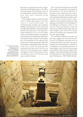 disturbed by looting holes and the modern restorations of Georges Legrain in the 1900s. However, despite the incomplete nature of the available data, extensive remains of mudb r i c k w a l l s w e r e u n cov e r e d d u r i n g this operation. These vestiges reveal a structure of at least 14.8 m in length (east-west) in the nor th, 12.16 m in wid th (nor th-sou th). The architectural plan coincides with a tripartite building comprising three rooms at the back of a large space (probably a courtyard), situated behind a transverse room. The walls have a uniform thickness of 1.2 m or 1.3 m (2.5 cubits). These are certainly foundations, as evidenced by the presence of foundation pits, filled often with ceramic sherds. However, in three places, part of the elevation of the walls has been preserved, the interval having been filled with intentionally crushed sherds mixed with some brown silt, in which f lint tools and seal impressions have been found. No floor was observed. The orientation of the vestiges corresponds to that of the temple of Amun and differs by about -6.5° from that of the upper sandstone temple.