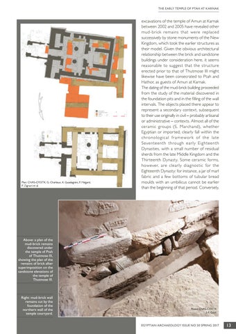 excavations of the temple of Amun at Karnak between 2002 and 2005 have revealed other mud-brick remains that were replaced successively by stone monuments of the New Kingdom, which took the earlier structures as their model. Given the obvious architectural relationship between the brick and sandstone buildings under consideration here, it seems reasonable to suggest that the structure erected prior to that of Thutmose III might likewise have been consecrated to Ptah and Hathor, as guests of Amun at Karnak. The dating of the mud-brick building proceeded from the study of the material discovered in the foundation pits and in the filling of the wall intervals. The objects placed there appear to represent a secondary context, subsequent to their use originally in civil – probably artisanal or administrative – contexts. Almost all of the ceramic groups (S. Marchand), whether Egyptian or imported, clearly fall within the chr onological fr amewor k of the late Seventeenth through early Eighteenth Dynasties, with a small number of residual sherds from the late Middle Kingdom and the Thirteenth Dynasty. Some ceramic forms, however, are clearly diagnostic for the Eighteenth Dynasty: for instance, a jar of marl fabric and a few bottoms of tubular bread moulds with an umbilicus cannot be earlier than the beginning of that period. Conversely,