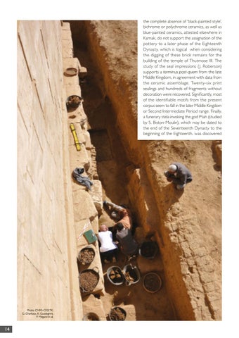 the complete absence of ‘black-painted style’, bichrome or polychrome ceramics, as well as blue-painted ceramics, attested elsewhere in Karnak, do not support the assignation of the pottery to a later phase of the Eighteenth Dynasty, which is logical when considering the digging of these brick remains for the building of the temple of Thutmose III. The study of the seal impressions (J. Roberson) supports a terminus post-quem from the late Middle Kingdom, in agreement with data from the ceramic assemblage. Twenty-six print sealings and hundreds of fragments without decoration were recovered. Significantly, most of the identifiable motifs from the present corpus seem to fall in the later Middle Kingdom or Second Intermediate Period range. Finally, a funerary stela invoking the god Ptah (studied by S. Biston-Moulin), which may be dated to the end of the Seventeenth Dynasty to the beginning of the Eighteenth, was discovered