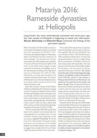 Matariya 2016: Ramesside dynasties at Heliopolis Long known, but never systematically excavated until some years ago, the main temple of Heliopolis is beginning to reveal new information. Aiman Ashmawy and Dietrich Raue summarise the findings of the past seven seasons. Plenty of evidence for Ramesside activities in the temple of Heliopolis has been uncovered since the excavations of the EES in 1911. Previously, only displaced objects in Alexandria, Rome and Florence had been testimony of their buildings. The provenance of most monuments was unfortunately never recorded. The work of the late Abd el-Aziz Saleh at Tell Hisn, on the other hand, brought to light important monuments and buildings, such as the administrative building of the high-priest and son of Ramesses IX (1129–1111 BC), Nebmaatra, but they were located in the northern extension of the temple. The column of Merenptah, too, commemorating the victory over Libyan tribes, was found north of the internal enclosure wall. Since 2012, the joint mission of the Ministry of State for Antiquities, the University of Leipzig and the University of Applied Sciences Mainz at Matariya/Heliopolis has been focusing on the main temple, which for many reasons has never been systematically excavated before. Seven seasons later, and especially after the discoveries made in autumn 2016, we have a clearer idea of the various activities of the Ramesside kings, especially of Ramesses II (1279–1213 BC). The first temple (area 200–203) was located close to the western main entrance (see the map opposite). It is nowadays known as ‘Suq el-Khamis’ and the mission reported on this sanctuary in Egyptian Archaeology 46. At the time of its construction, Ramesses II made ex tensive use of statuar y of the Middle Kingdom and of talatat blocks. It seems plausible to suggest that a temple of the Amarna Period might have been erected on the same spot.