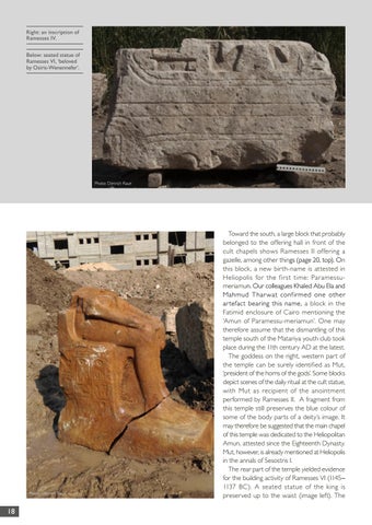 Toward the south, a large block that probably belonged to the offering hall in front of the cult chapels shows Ramesses II offering a gazelle, among other things (page 20, top). On this block, a new birth-name is attested in Heliopolis for the first time: Paramessumeriamun. Our colleagues Khaled Abu Ela and Mahmud Thar wat conf irmed one other ar tefact bearing this name, a block in the Fatimid enclosure of Cairo mentioning the ‘Amun of Paramessu-meriamun’. One may therefore assume that the dismantling of this temple south of the Matariya youth club took place during the 11th century AD at the latest. The goddess on the right, western part of the temple can be surely identified as Mut, ‘president of the horns of the gods’. Some blocks depict scenes of the daily ritual at the cult statue, with Mut as recipient of the anointment performed by Ramesses II. A fragment from this temple still preserves the blue colour of some of the body parts of a deity’s image. It may therefore be suggested that the main chapel of this temple was dedicated to the Heliopolitan Amun, attested since the Eighteenth Dynasty. Mut, however, is already mentioned at Heliopolis in the annals of Sesostris I. The rear part of the temple yielded evidence for the building activity of Ramesses VI (1145– 1137 BC). A seated statue of the king is preserved up to the waist (image left). The