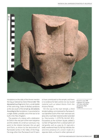 to have contributed to this temple, and there is no evidence for later activity nor any reused material such as talatat blocks from the Amarna Period. On the way to the main temple, a third temple building, commissioned by Ramesses II, was identified south of the main west-east axis (area 221), much later restored and/or extended by Nec tanebo I (379/ 78 –361/60 BC). Excavations at the northern façade yielded a number of fragments from a colossal sphinx of red granite, such as a paw (p. 21, top) and a badly weathered head. Its flat top indicates the one-time presence of a crown made of a separate block, as found in other sphinxes of