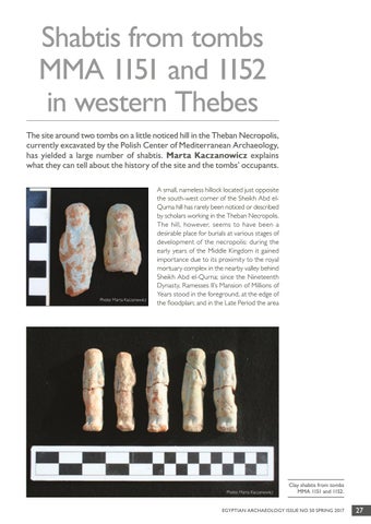 Shabtis from tombs MMA 1151 and 1152 in western Thebes The site around two tombs on a little noticed hill in the Theban Necropolis, currently excavated by the Polish Center of Mediterranean Archaeology, has yielded a large number of shabtis. Marta Kaczanowicz explains what they can tell about the history of the site and the tombs’ occupants.