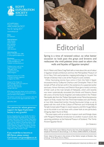 Editorial Spring is a time of renewed colour, so what better occasion to look past the greys and browns and rediscover the vivid palettes once used to adorn the walls and façades of Egyptian temples? Erin A. Peters and Diana Craig Patch tell us more about the use of colour in Egyptian temple architecture and how the Metropolitan Museum of Art in New York used projection mapping technology to ‘re-paint’ the Temple of Dendur that is one of the Museum’s iconic exhibits. Other fascinating stories have come in from the field in Egypt: excavations led by Guillaume Charloux and Christophe Thiers in the temple of Ptah at Karnak confirm the existence of a suspected earlier sanctuary; Aiman Ashmawy and Dietrich Raue give a handy summary of their work at the main temple of Heliopolis, which until recently was never systematically excavated; Jiro Kondo and Nozomu Kawai tell a story of tombs found, forgotten and rediscovered in the Theban Necropolis; also from the Theban Necropolis comes Marta Kaczanowiczs report on finds, mostly from the Third Intermediate and Late Periods, at two little researched tombs; Hourig Sourouzian brings us up to speed with the work of the Colossi of Memnon and Amenhotep III Temple Conservation Project in recent seasons; and Dirk Huyge follows up on his article in our last issue with a closer look at one particularly intriguing object found at Elkab. The issue opens with an article on museum work and fittingly closes with Margaret Maitlands introduction to another museum event, the upcoming exhibition at the National Museum of Scotland, ‘The Tomb: Ancient Egyptian Burial’. Jan Geisbusch Above: stela of the mason Djehuty found at the limit of the foundation pit of the temple of Thutmose III. See article pp. 11-15. Photo: CNRS-CFEETK, A. Elnasseh. Cover: detail of the paint in the pronaos of the Hathor temple at Dendera. See article pp. 4-10. Photo: Erin A. Peters. EGYPTIAN ARCHAEOLOGY ISSUE NO 50 SPRING 2017