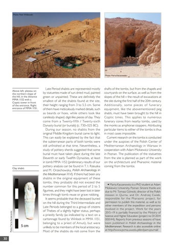 shafts of the tombs, but from the chapels and courtyards on the surface, as well as from the slopes of the hill – the result of excavations at the site during the first half of the 20th century. Additionally, some pieces of funer ar y equipment, like the abovementioned peg shabti, must have been brought to the hill in Coptic times. This applies to numerous funerary cones from nearby tombs, used by the monks as amphorae stoppers. Attributing particular items to either of the tombs is thus in most cases impossible. Current research on the tombs is conducted under the auspices of the Polish Center of Mediterranean Archaeology in Warsaw in cooperation with Adam Mickiewicz University in Poznan. The publication of the statuettes from the site is planned as part of the work on the architecture and Pharaonic material coming from the tombs.