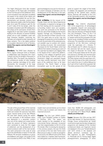 Dendera: The IFAO team directed by Pierre Zignani continued work at Dendera in collaboration with Macquarie Univ (Yann Tristant) and the OI (Grégory Marouard) in Nov/Dec 2016. The season was devoted to the architectural studies of cultic buildings (Roman mammisi, technology of the ashlar stonework), the excavation of the large Pharaonic cemetery and the settlement.