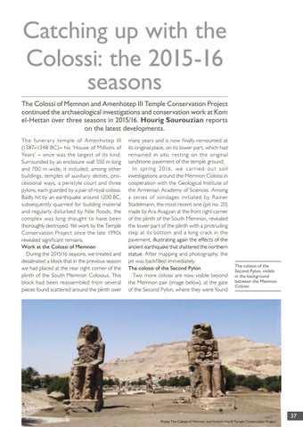 Catching up with the Colossi: the 2015-16 seasons The Colossi of Memnon and Amenhotep III Temple Conservation Project continued the archaeological investigations and conservation work at Kom el-Hettan over three seasons in 2015/16. Hourig Sourouzian reports on the latest developments. The funerar y temple of Amenhotep III (1387–1348 BC)– his ‘House of Millions of Years’ – once was the largest of its kind. Surrounded by an enclosure wall 550 m long and 700 m wide, it included, among other buildings, temples of auxiliary deities, processional ways, a peristyle court and three pylons, each guarded by a pair of royal colossi. Badly hit by an earthquake around 1200 BC, subsequently quarried for building material and regularly disturbed by Nile floods, the complex was long thought to have been thoroughly destroyed. Yet work by the Temple Conservation Project since the late 1990s revealed significant remains. Work at the Colossi of Memnon During the 2015/16 seasons, we treated and desalinated a block that in the previous season we had placed at the rear right corner of the plinth of the South Memnon Colossus. This block had been reassembled from several pieces found scattered around the plinth over
