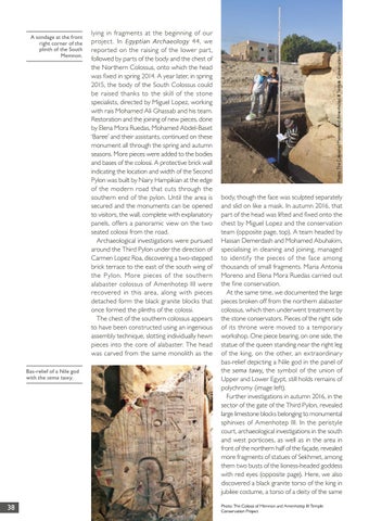 body, though the face was sculpted separately and slid on like a mask. In autumn 2016, that part of the head was lifted and fixed onto the chest by Miguel Lopez and the conservation team (opposite page, top). A team headed by Hassan Demerdash and Mohamed Abuhakim, specialising in cleaning and joining, managed to identify the pieces of the face among thousands of small fragments. Maria Antonia Moreno and Elena Mora Ruedas carried out the fine conservation. At the same time, we documented the large pieces broken off from the northern alabaster colossus, which then underwent treatment by the stone conservators. Pieces of the right side of its throne were moved to a temporary workshop. One piece bearing, on one side, the statue of the queen standing near the right leg of the king, on the other, an extraordinary bas-relief depicting a Nile god in the panel of the sema tawy, the symbol of the union of Upper and Lower Egypt, still holds remains of polychromy (image left). Further investigations in autumn 2016, in the sector of the gate of the Third Pylon, revealed large limestone blocks belonging to monumental sphinxes of Amenhotep III. In the peristyle court, archaeological investigations in the south and west porticoes, as well as in the area in front of the northern half of the façade, revealed more fragments of statues of Sekhmet, among them two busts of the lioness-headed goddess with red eyes (opposite page). Here, we also discovered a black granite torso of the king in jubilee costume, a torso of a deity of the same Photo: The Colossi of Memnon and Amenhotep III Temple Conservation Project
