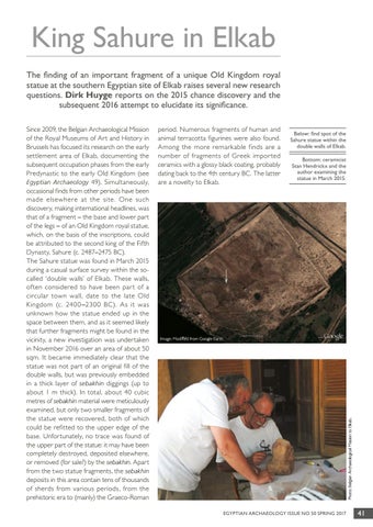 King Sahure in Elkab The finding of an important fragment of a unique Old Kingdom royal statue at the southern Egyptian site of Elkab raises several new research questions. Dirk Huyge reports on the 2015 chance discovery and the subsequent 2016 attempt to elucidate its significance. period. Numerous fragments of human and animal terracotta figurines were also found. Among the more remarkable finds are a number of fragments of Greek impor ted ceramics with a glossy black coating, probably dating back to the 4th century BC. The latter are a novelty to Elkab.