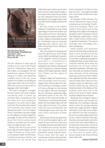 tomb ‘exceptional’ are likely to have been the norm – but largely concealed from us by the lack of other near-intact kings’ tombs. An Epilogue briefly discusses the events following the king’s funeral, including issues concerning Tutankhamun’s two successors. There is no mention of the recent work on the hydrology of the Valley of the Kings and the date at which Tutankhamun’s tomb was definitively sealed below a flood layer, a rather curious omission, given its significant implications. The volume concludes with a chronology and a select bibliography. While packed with impor tant material and attractively produced, the book is most certainly not for the novice or casual Egyptophile. An issue is that while it is generally very good at revealing the flaws in many of the more ‘inventive’ theories, some views are dismissed out of hand without substantive explanation. Although many such dismissals are perfectly justified, some indication of the underlying reasoning would have been helpful. One might also note that where others’ views are taken down, there are many occasions where no alternative is put forward. While this may well be an honest admission of the flakiness of the evidence, some over t hint at the author’s own views on these matters would be helpful here and there. Stylistically, the coverage of topics is somewhat uneven, and one gets the feeling that one is looking at separate essays written for varying audiences rather than a single narrative. A slightly odd feature that while most scholars are referred to by their surnames, a few are on occasion called by their first names, a level of selective informality that does not sit particularly well within a book of this kind. Nevertheless, it is an important critical review of many of the key topics and theories relating to the reign of Tutankhamun, and as such is a ‘must have’ for anyone with a serious interest in the Amarna Period and its aftermath. AIDAN DODSON