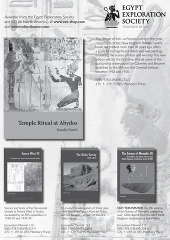 Available from the Egypt Exploration Society and ISD (in North America) at www.ees-shop.com and www.isdistribution.com The temple of Seti I at Abydos is one of the great monuments of the New Kingdom: Rosalie David’s book, last printed more than 30 years ago, offers a guide to its magnificent reliefs and wall paintings, explaining the scenes of ritual and worship. This new edition will, for the first time, include some of the outstanding watercolours by Calverley and Broome published by the EES and the Oriental Institute between 1933 and 1958. ISBN 978-0-85698-232-3 £35 • £29.75 (EES Members’ Price)