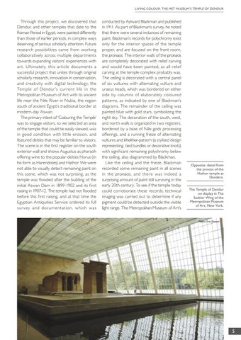 conducted by Aylward Blackman and published in 1911. As part of Blackman’s survey, he noted that there were several instances of remaining paint. Blackman’s records for polychromy exist only for the interior spaces of the temple proper, and are focused on the front room, the pronaos. The interior walls of the pronaos are completely decorated with relief carving and would have been painted, as all relief carving at the temple complex probably was. The ceiling is decorated with a central panel of six vultures with alternating vulture and uraeus heads, which was bordered on either side by columns of elaborately coloured patterns, as indicated by one of Blackman’s diagrams. The remainder of the ceiling was painted blue with gold stars, symbolizing the night sky. The decoration of the south, west, and north walls is organized in two registers, bordered by a base of Nile gods processing offerings, and a running frieze of alternating vultures and khekher-pattern (a stylised design representing tied bundles or decorative knots) with significant remaining polychromy below the ceiling, also diagrammed by Blackman. Like the ceiling and the frieze, Blackman recorded some remaining paint in all scenes in the pronaos , and there was indeed a surprising amount of paint still surviving in the early 20th century. To see if the temple today could corroborate these records, technical imaging was carried out to determine if any pigment could be detected outside the visible light range. The Metropolitan Museum of Art’s