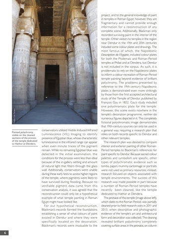 project, and to the general knowledge of paint in temples in Roman Egypt; however, they are fragmentary and cannot provide enough information for a reconstruction of any complete scene. Additionally, Blackman only recorded surviving paint in the interior of the temple. Other visitors to temples in the region near Dendur in the 19th and 20th centuries included some colour plates and drawings. The most famous of which, the Napoleonic Description de l’Egypte, included colour plates for both the Ptolemaic and Roman-Period temples at Philae and at Dendera, but Dendur is not included in the corpus. As such, it is problematic to rely on the Napoleonic plates to inform a colour recreation of Roman-Period temple painting beyond evidence of brilliant polychromy. The problems presented by reference to the 19th-century Napoleonic plates is demonstrated even more strikingly by those from the first accepted architectural study of the Temple of Dendur, published by François Gau in 1822. Gau’s study included one polychromatic plate for the temple. However, this scene exists nowhere in the temple’s decoration programme, neither do numerous figures depicted in it. This completely fictional polychromatic image demonstrates that 19th-century sources can only be used in a general way, requiring a research plan that relies on both records specific to Dendur and other relevant temples. The research plan was devised to compare interior and exterior painting of other RomanPeriod temples to Blackman’s references for paint specific to Dendur. Because sacred colour palettes and symbolism are specific, other types of polychromatic evidence such as tombs, papyri, mummy cartonnage or portraits were not used as primary resources; instead, research focused on objects associated with temple environments. The success of this research was made possible in part because a number of Roman-Period temples have recently been cleaned, like the temple dedicated to Hathor at Dendera. The pronaos of this temple (image above left), which dates to the Roman Period, was partially cleaned prior to field research visits in 2011 and 2013, when descriptive and photographic evidence of the temple’s art and architectural form and decoration was collected. The cleaning revealed brilliant polychromy completely covering surface areas in the pronaos, on column