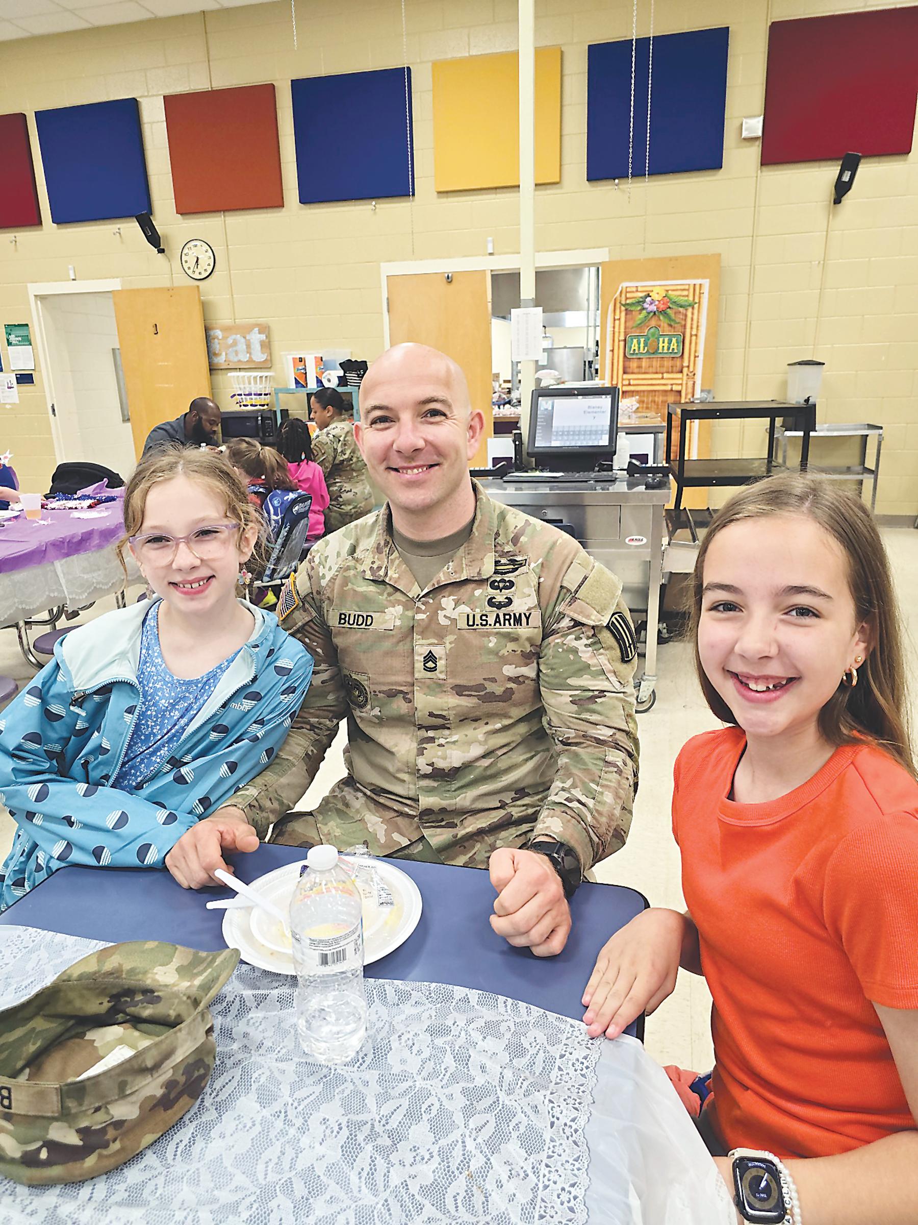 BES third grader Quinn Budd (left) and BES fifth grader Parker Budd (right) enjoy the Purple Star Breakfast with their father, Louis Budd.