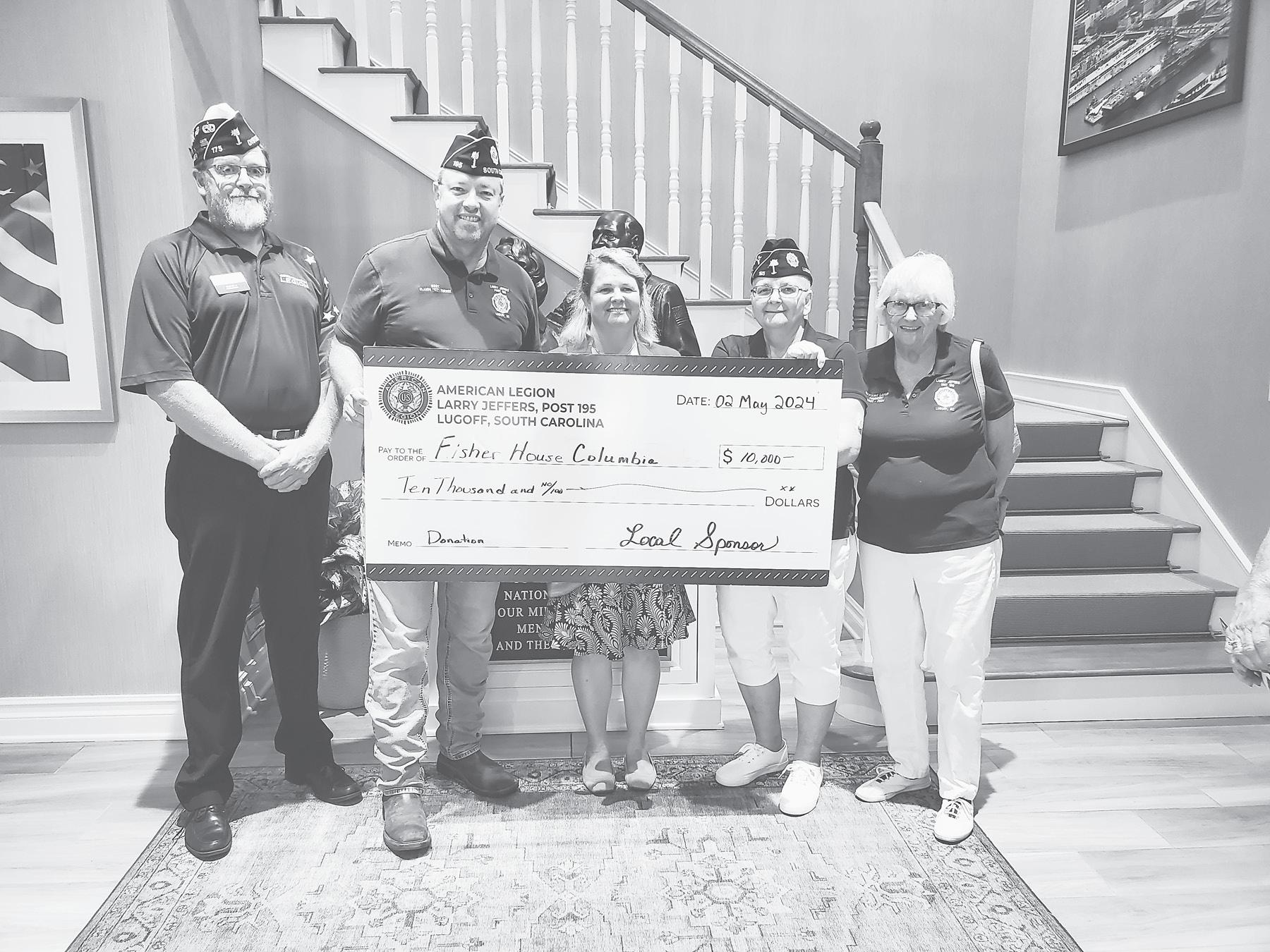 Post 195 presents the Columbia Fisher House with a donation of $10,000. Presenting the check to Fisher House Manager Chandler Rhodes (center) are (l-r) American Legion South Carolina District 11 Commander Pete St. Onge, American Legion Post 195 Commander Cliff Turner, Post 195 2nd Vice Commander Kate Brock, and Past Auxiliary Unit 195 President Marianne Larson.