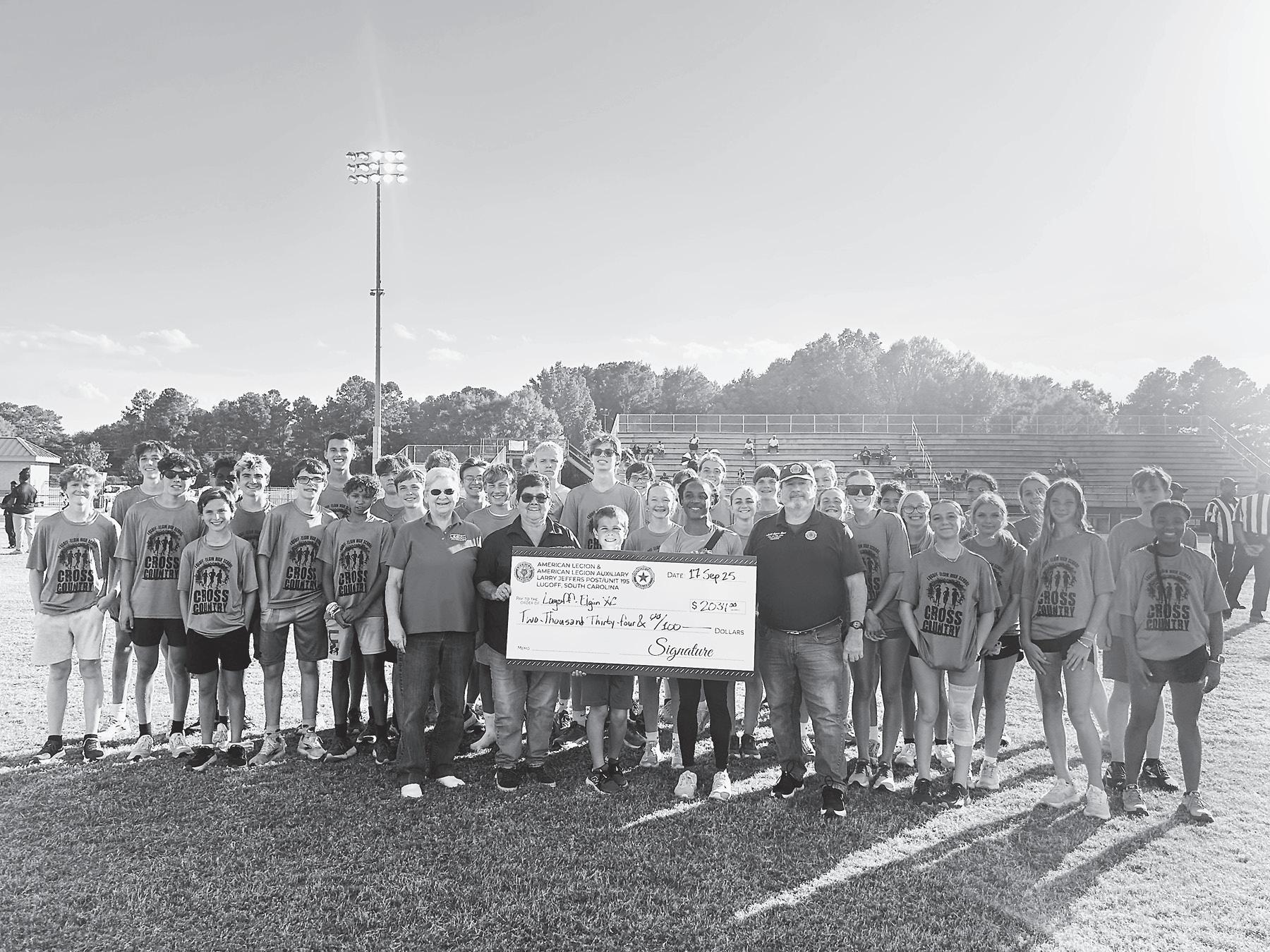The Larry Jeffers Post 195 of the American legion in Lugoff presented the Lugoff-Elgin Cross Country team a donation for the team's kit before the Stover Middle-Fairfield Middle football game Wednesday evening September 17 at the L-E football stadium.