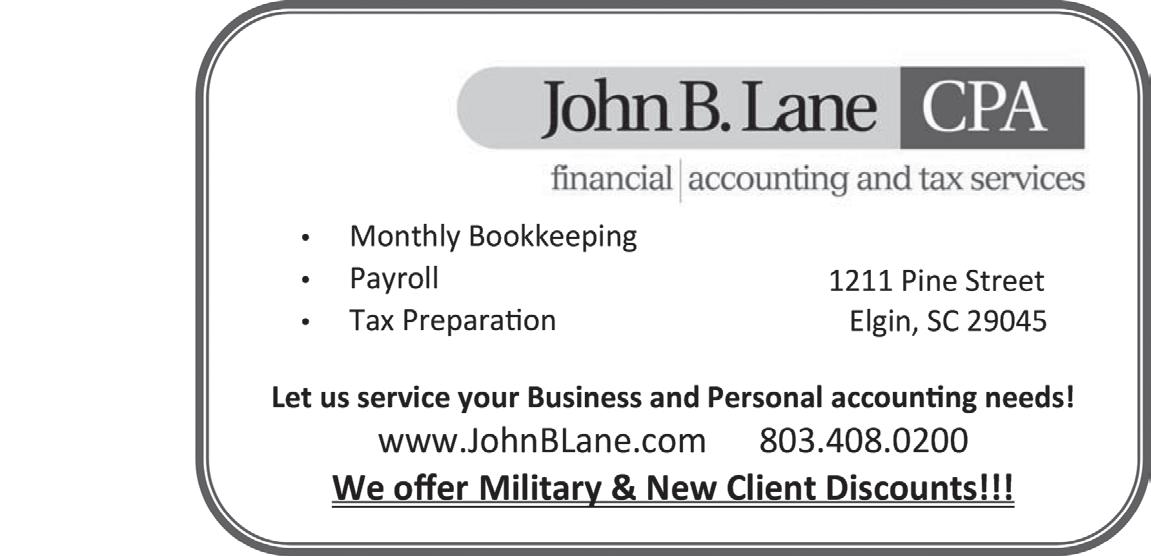 Rates are net - discount agreements must be reflected on the publication order. Invoices due on receipt. Tearsheets and proofs available upon request. Advertising setup, changes and publication verification are provided at no charge. 15% agency comm. is 30-days firm. Photography charges negotiable. By-line articles are the property of the contributor and may not be reproduced without permission. The Elgin News, PO Box 152, Elgin, SC 29045 · (803) 513-5108 Cate Goff, Editor · Email: elginnews@gmail.com Cate