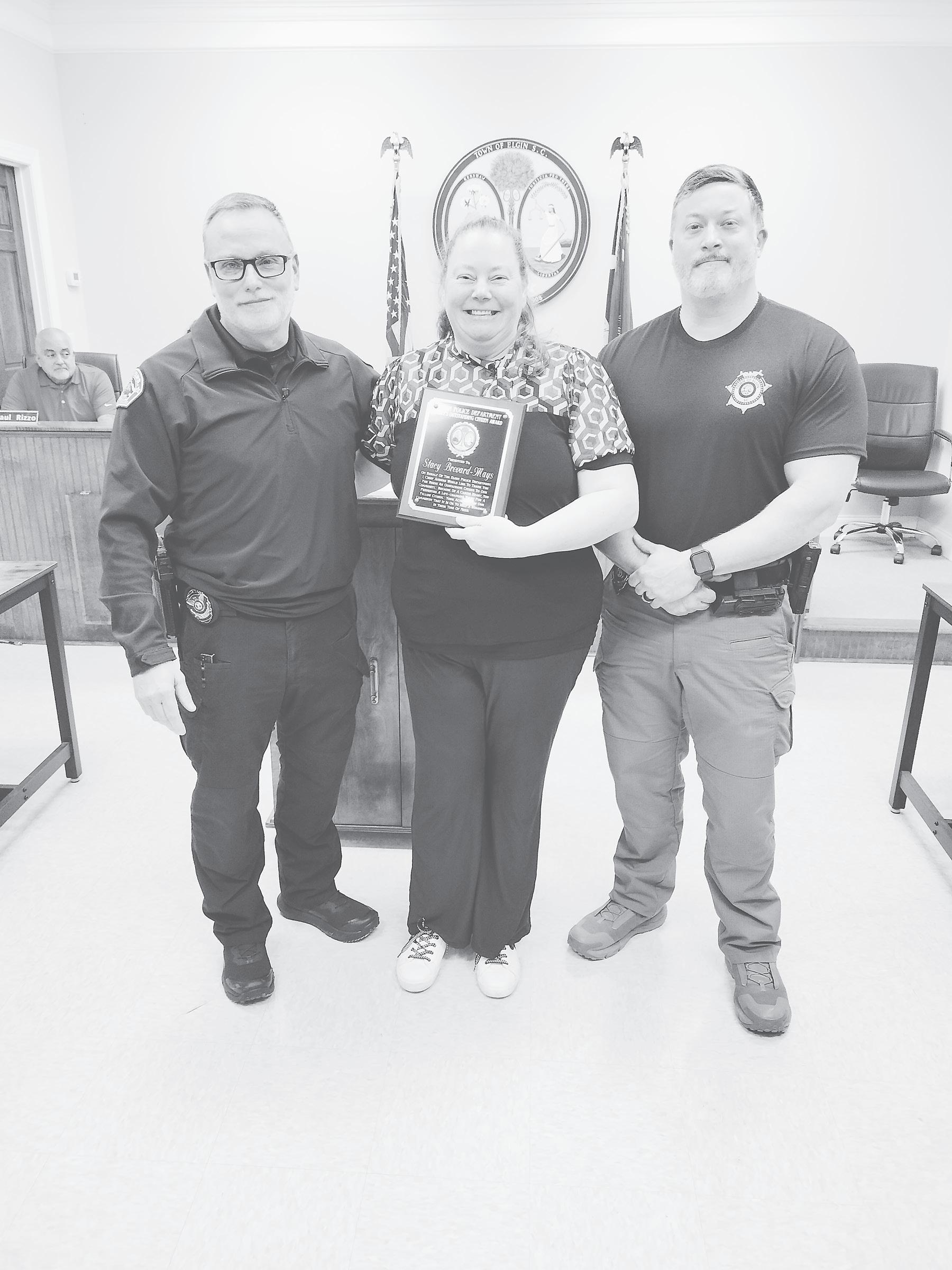 Stacy Brevard-Mays was recognized at the February Town Council meeting as Chief Alan Anders and Investigator Aaron Threatt presented her with the Elgin Police Chief’s Outstanding Citizens Award.