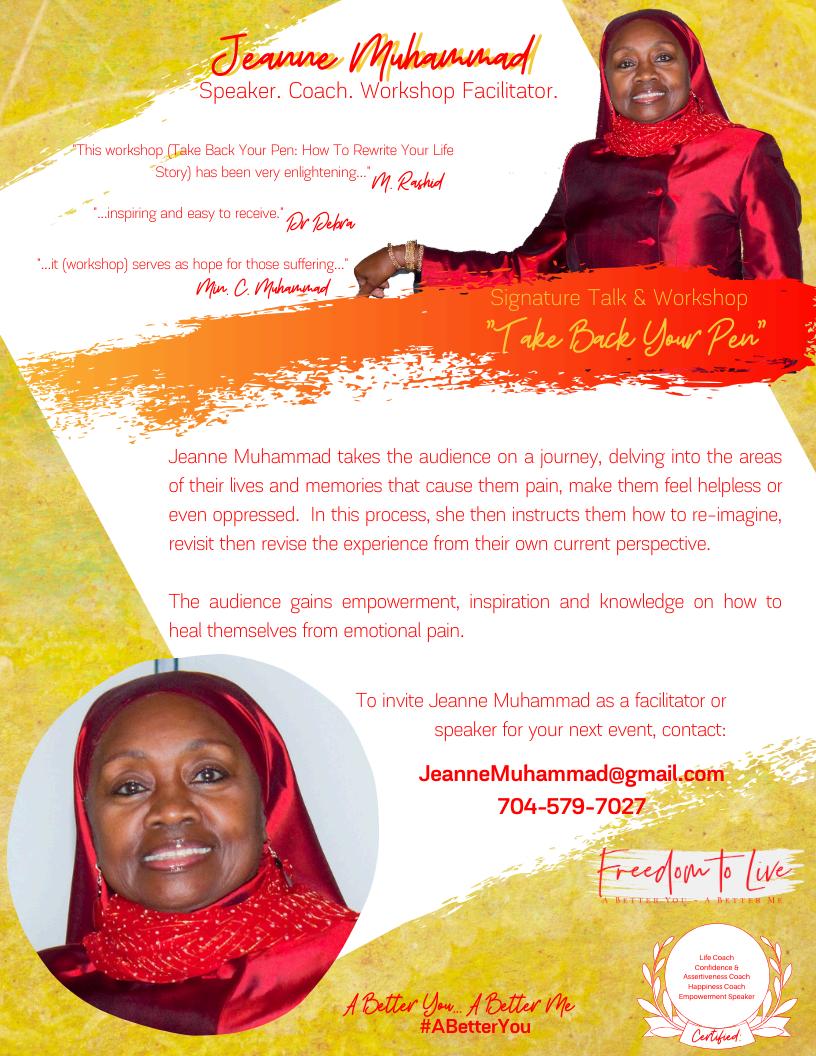 Jeanne Muhammad is the author of nine books. Her signature book is “Take Back Your Pen: How to Rewrite Your Life Story.” Jeanne is an Advocate against Domestic Violence. She is a speaker on The Domestic Violence Speakers Bureau of Mecklenburg County in Charlotte, NC, and a member of The Domestic Violence Research Collaborative Committee. She supports Safe Alliance, a resource for victims of domestic violence. She is also a Wife, Mother, Grandmother and Great Grandmother.