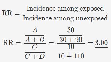 Consider a cohort study with 120 exposed and 120 unexposed individuals, where 30 and 10 outcome events occur in each group, respectively. Using the built-in calculators, the incidence among the exposed is calculated as 0.25, while the incidence among the unexposed is 0.08. The relative risk, comparing these two