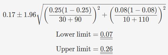 groups, is 3.00 with a 95% confidence interval of 1.54 to 5.86. Additionally, the risk difference is 0.17, with a confidence interval ranging from 0.07 to 0.26.