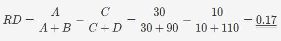 absolute and relative measures, including incidence among exposed and unexposed groups, relative risk with a 95% confidence interval, and risk difference with its corresponding confidence interval.