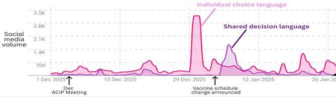 Volume of social media results for ‘individual choice’ and ‘shared decision-making’ language with reference to vaccines in the United States over time. Figure by Your Local Epidemiologist