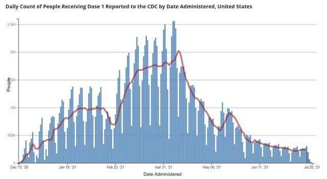 In the United States, 65.7% of 12+ population has at least one vaccine. Daily vaccination rates peaked April 8 (with 2.56 million people per day) and have slowly and painfully declined since (with 268,000 people on July 16).
