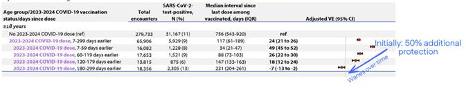 Also, the vaccines continue to provide additional protection about 50% against emergency room visits and hospitalization. Protection does still wane, dropping to roughly 18% at around four months. The decline is slower than before, particularly for hospitalization among adults aged 65 and older.