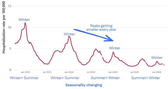 Interestingly, seasonality has recently shifted. We now reliably see two waves each year: one in winter, one in summer. But nationally over the past two years, the summer wave has been larger than the winter wave (see above). We don’t know why.