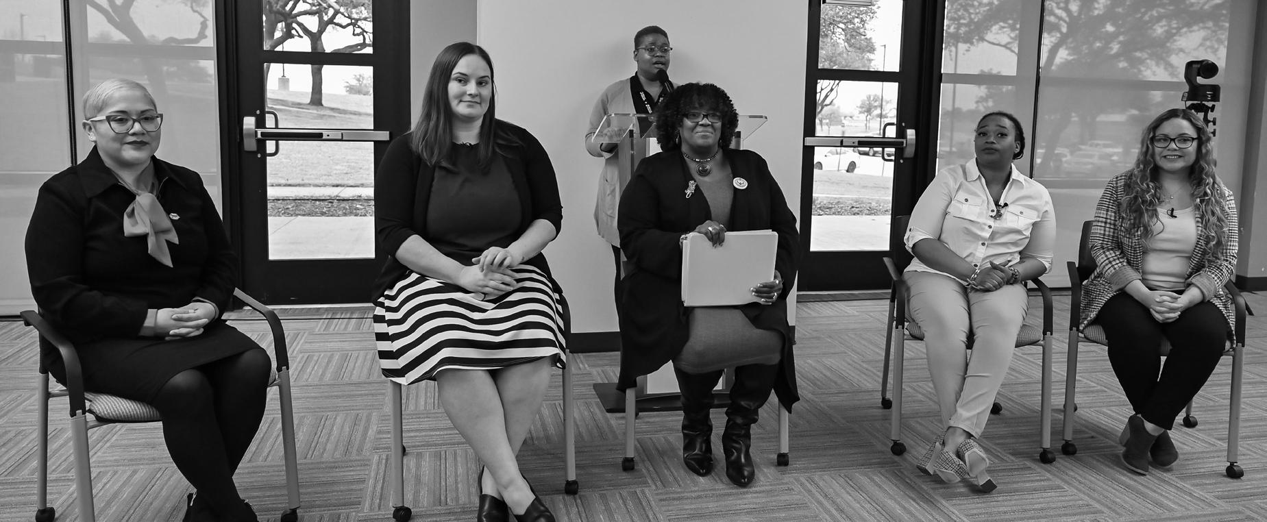 Dineen was one of five female veterans who spoke at Eastfield’s “Courageous Conversations: Women in the Military” event on March 21. The panel also featured fellow Marine Jacqueline Shorter and Army veteran Deandrea Montague, who are also program leads, as well as Air Force veteran Jessica Sanchez. It was moderated by VR Small, a Navy veteran and founder and CEO of the Veran Women’s Enterprise Center.