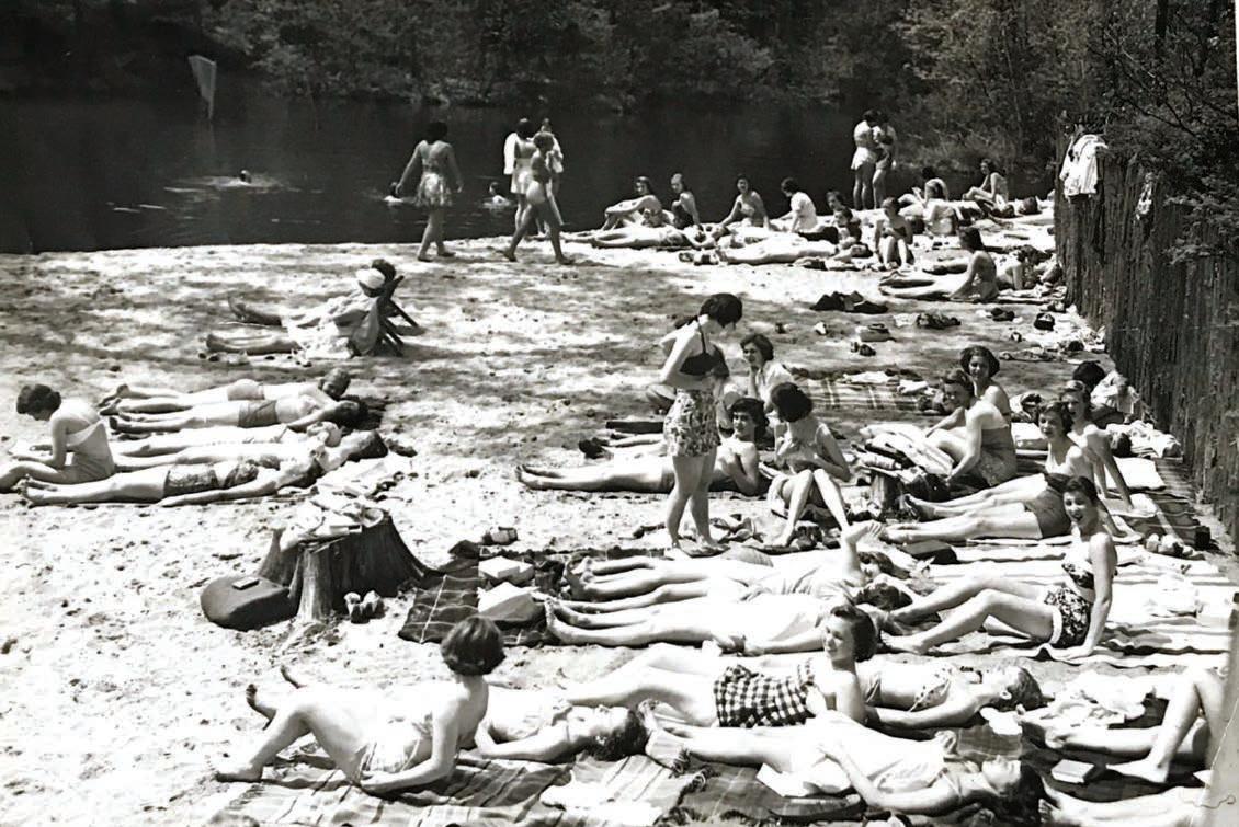 We are excited to share that a renovation of our archives is now underway. We hope to find many treasures to share, and will likely be asking for help in identifying photos and other items. Our institutional history is important to the understanding of who we are and where we came from, as well as being full of fun discovery. Thanks to the father of one of our students, we now know that The Ethel Walker School “Beach” was a popular swimming and sunbathing spot in what is now the pond area behind the horse barns. Much of the larger original pond was dredged and filled, and the “beach” was planted over to enhance the School’s riding facilities, but a small pond remains in its place. This scenic pond is now a gathering spot for bullfrogs and red-winged blackbirds but this photo from the early 1950s tells a different story!
