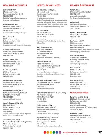 Evergreen Medical Group 206 South Elmwood Avenue Buffalo, New York 14201 716-847-0328 www.evergreenhs.org/emg Offering Primary Care, HIV testing, & more See our ad on page 13 Hens Pain Center 1829 Maple Road, Suite 102 Williamsville, New York 14221 716-276-8375 www.henspaincenter.com