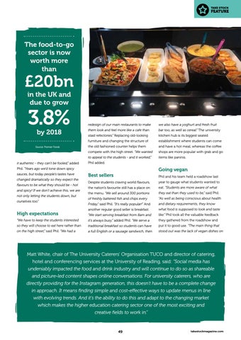 Matt White, chair of The University Caterers’ Organisation TUCO and director of catering, hotel and conferencing services at the University of Reading, said: “Social media has undeniably impacted the food and drink industry and will continue to do so as shareable and picture-led content shapes online conversations. For university caterers, who are directly providing for the Instagram generation, this doesn’t have to be a complete change in approach. It means finding simple and cost-effective ways to update menus in line with evolving trends. And it’s the ability to do this and adapt to the changing market which makes the higher education catering sector one of the most exciting and creative fields to work in.”