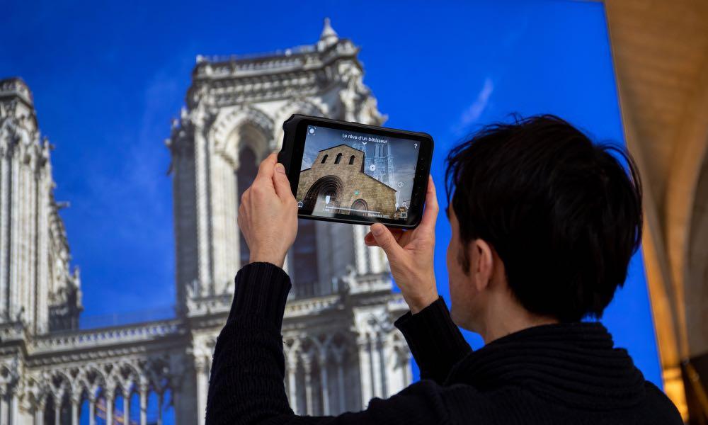 Guided by illuminated photo panels and 3-D models of Notre-Dame —including a full-size chimera—visitors use a HistoPad™, an interactive touch-screen tablet developed by Histovery, to step back in time to medieval Paris where they will meet stonemasons, craftsmen, and builders. From there they move forward through time where they will see the construction of the Gothic Choir in 1180, the arrival of the Holy Crown carried by Saint Louis in 1241, the coronation of Emperor Napoleon I in 1804, and the addition of the iconic Viollet-le-Duc spire in 1859, and witness Notre-Dame’s miraculous survival from the 2019 fire that shocked the world as the exhibit shows history unfold in real-time.