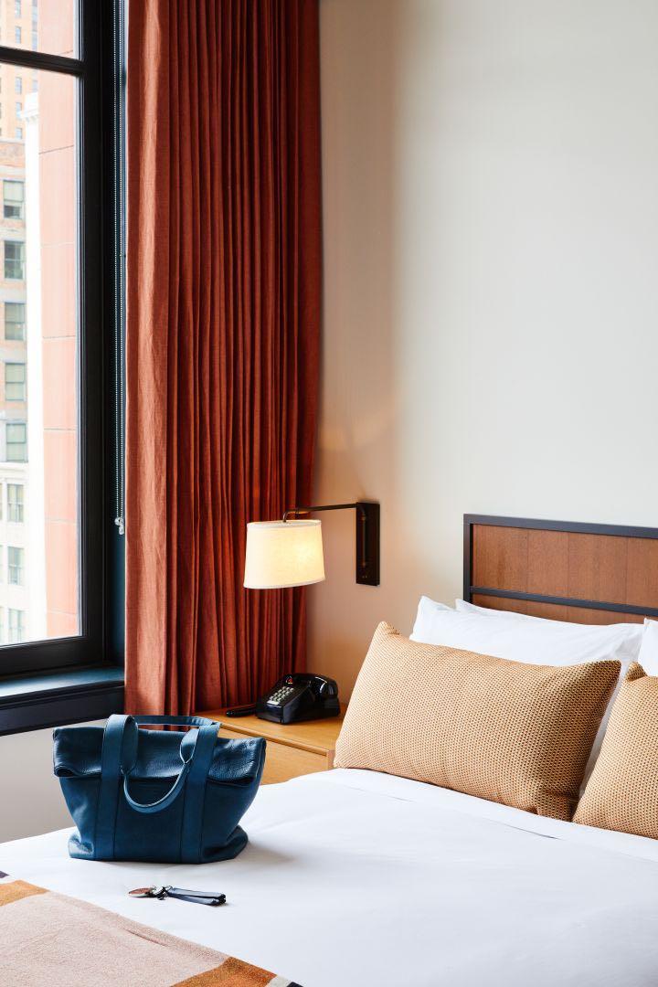Shinola Hotel’s accommodations are thoughtfully designed with varied layouts—featuring handcrafted millwork, custom mattresses, and wallpaper inspired by patterns found during the renovation process. The property marries two restored buildings—the old T.B. Rayl & Co. sporting goods and hardware store and a former Singer sewing-machine store—with three brand new buildings modeled after downtown Detroit’s historic architecture.