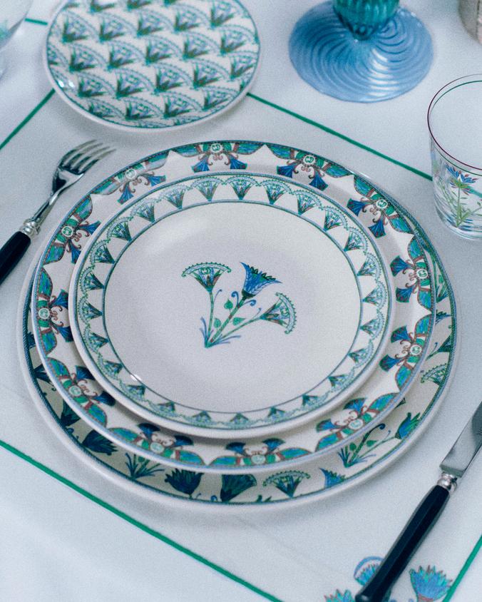 La línea Lotus, ideada por Cordelia de Castellane y que celebra los vínculos inquebrantables que unen a Dior con Egipto desde 1947*, está salpicada de encantadoras flores de loto. Consideradas sagradas en la época faraónica, estas plantas acuáticas en delicados tonos de azul y verde adornan una vajilla de barro, una bandeja lacada, mantelería, cristalería pintada a mano, una jarra de interior y elegantes candelabros de Salento. Una oda al refinamiento y la excelencia.