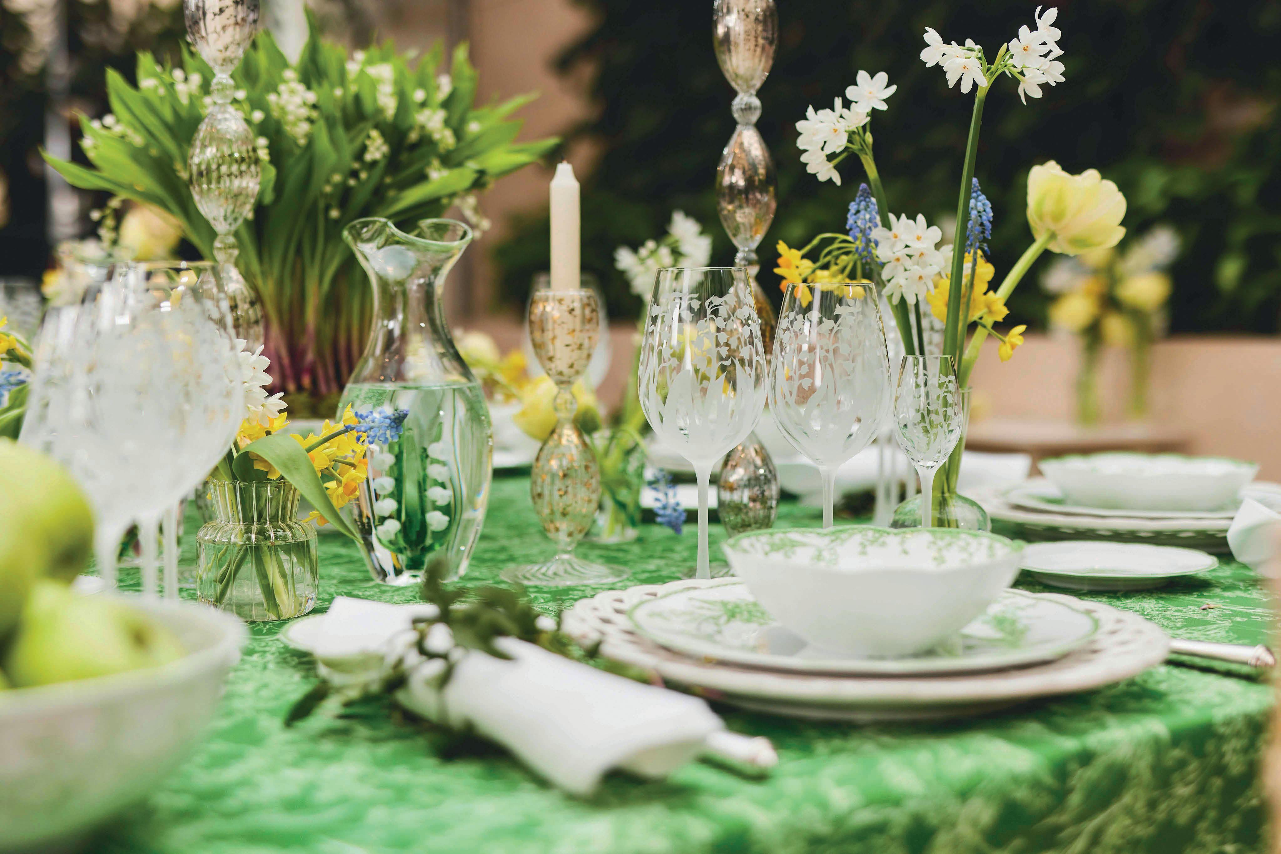 Naturaleza y botánica, plasmadas en una composición cromática de esmeraldas, amarillos y blancos, esperaban ser alumbradas durante la velada a la luz de las velas.