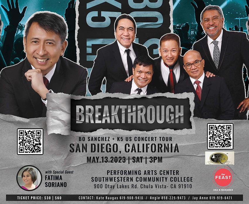 SAN DIEGO, CA -- Bro. Bo Sanchez together with the K5 Preachers namely Arun Gogna, Alvin Barcelona, Jon Escoto, Obet Cabrillas, and Adrian Panganiban will have an Evangelical Concert Tour titled “Breakthrough” on May 13th, 2023 at 3 PM at Southwestern College Performing Arts Center.