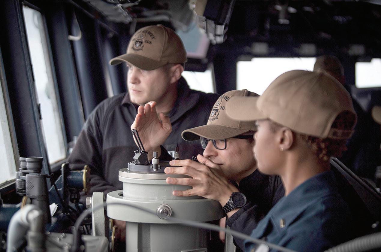 PHILIPPINE SEA -- Lt. Samuel Galli, left, from Cupertino, California, Ensign Sebastian Madrid, from Chula Vista, California, and Ensign Krystal Francis, from Augusta, Georgia, Stand watch on the bridge aboard the Arleigh Burke-class guidedmissile destroyer USS Dewey (DDG 105) while ships of the America and Essex Amphibious Ready Groups, and Abraham Lincoln Carrier Strike Group, sail in formation with the Japan Maritime Self-Defense Force during exercise Noble Fusion. Noble Fusion demonstrates that Navy and Marine Corps forward-deployed stand-in naval expeditionary forces can rapidly aggregate Marine Expeditionary Unit/ Amphibious Ready Group teams at sea, along with a carrier strike group, as well as other joint force elements and allies, in order to conduct seadenial, seize key maritime terrain, guarantee freedom of movement, and create advantage for U.S., partner and allied forces. Naval Expeditionary forces conduct training throughout the year, in the Indo-Pacific, to maintain readiness. (U.S. Navy photo by Mass Communication Specialist 1st Class Benjamin Lewis)