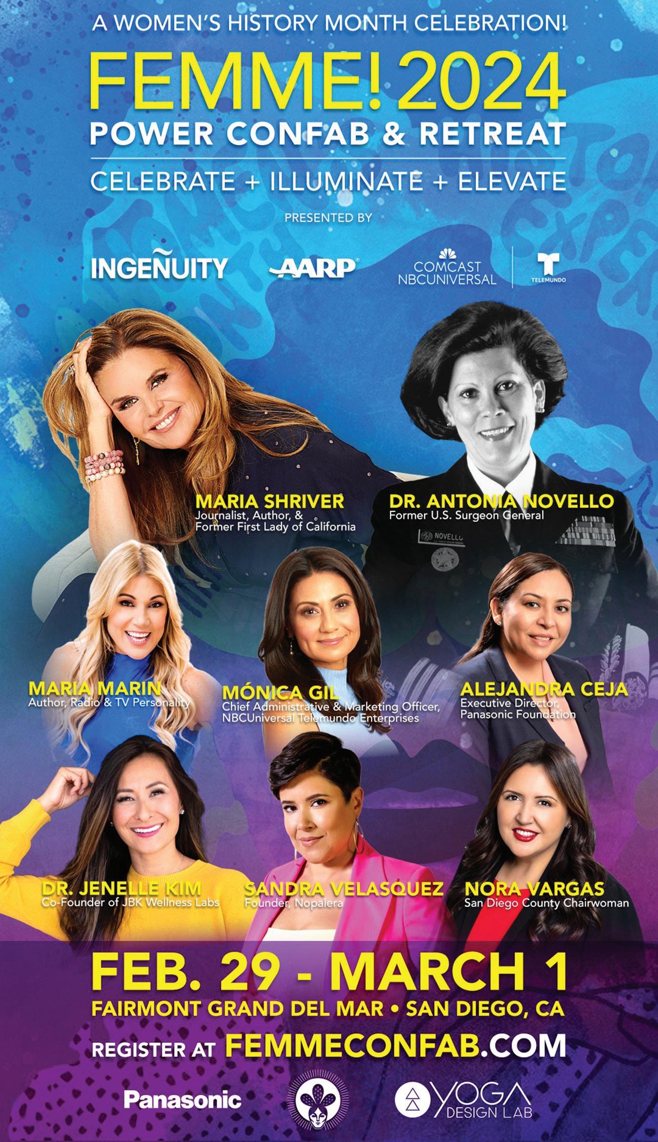 SAN DIEGO, CA -- Acclaimed content and conference producer INGEÑUITY announces its Women’s History Month kick-off celebration, FEMME! 2024 Power Confab & Retreat, presented by AARP, Comcast NBCUniversal Telemundo, and INGEÑUITY. The event is scheduled for February 29-March 1, at the Fairmont Grand Del Mar in San Diego, California.